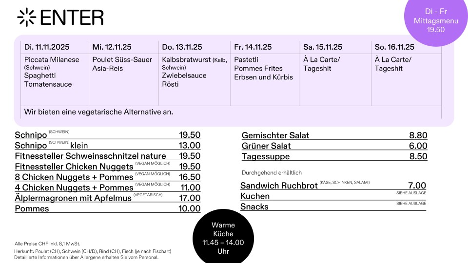 Möchten Sie Ihre Gruppenführung oder Ihren Event bei uns im Enter Restaurant ausklingen lassen? Oder würden Sie Ihre Gäste gerne mit einem Apéro willkommen heissen? Wir beraten Sie gerne zum passenden kulinarischen Angebot für Ihren Anlass.
